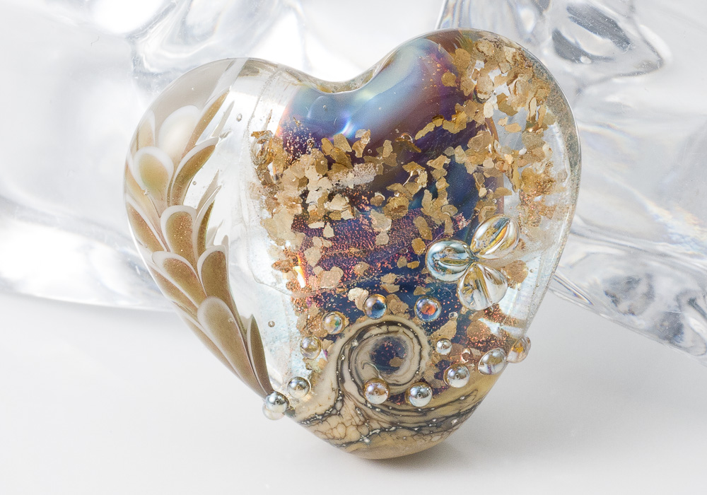 A hand made glass heart bead made with silver glass that reacts to give blues with a tubular dahlia flower along one edge, gold glitter orange dichroic glass and metallic dots and flowers. The heart measures 30x30mm and has a 2mm diameter hole.
