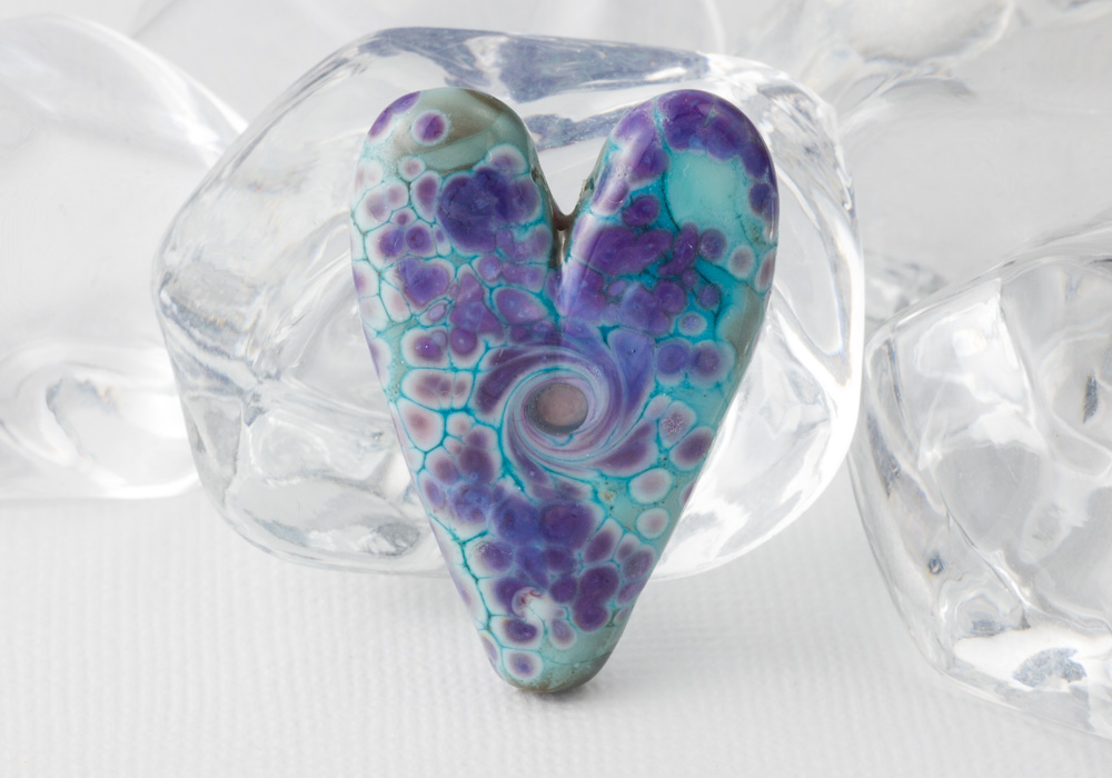 A lovely hand made glass bead in purple and turquoise with swirls on either side. The bead measures 40x27mm and has a 2mm diameter hole.