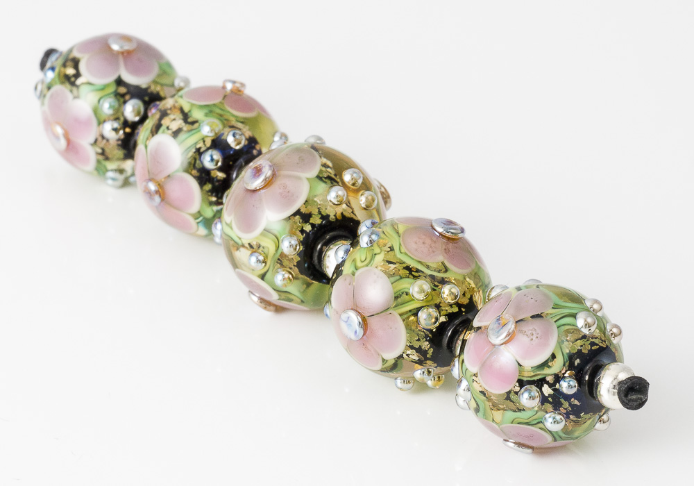 A set of 5 hand made glass lampwork flowery beads in black with a gold shimmery centre, green vines and pink flowers. All finished with golden dots. The beads measure 14x15mm with a 2mm hole.
